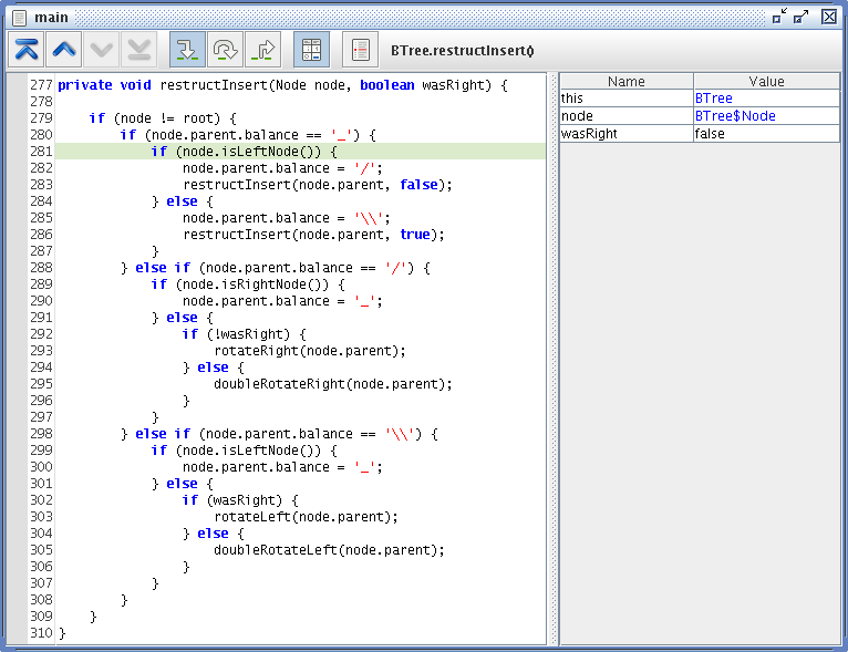 It enables quick navigation within the call stack (bottom, down, up and top). Additionally, the well-known flow control operations step in, step over and step out are supported and every thread can be inspected separately.